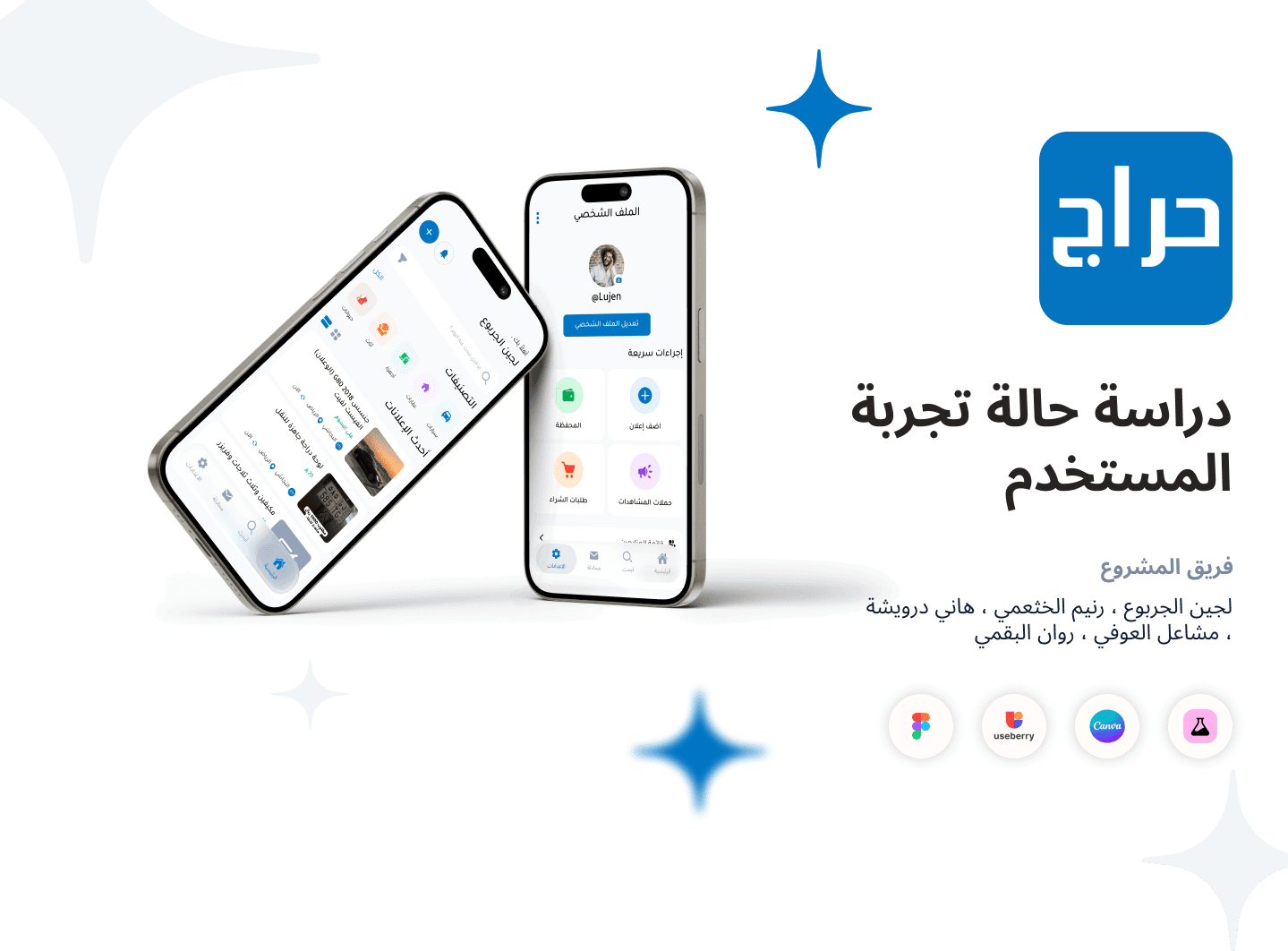 البحث : مقابلات مستخدمين ، اختبار الخمس ثواني ، اختبار سهولة الاستخدام ، تحليل المنافسين ، خريطة رحلة المستخدم ، خريطة تدفق المستخدم