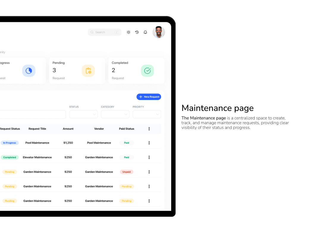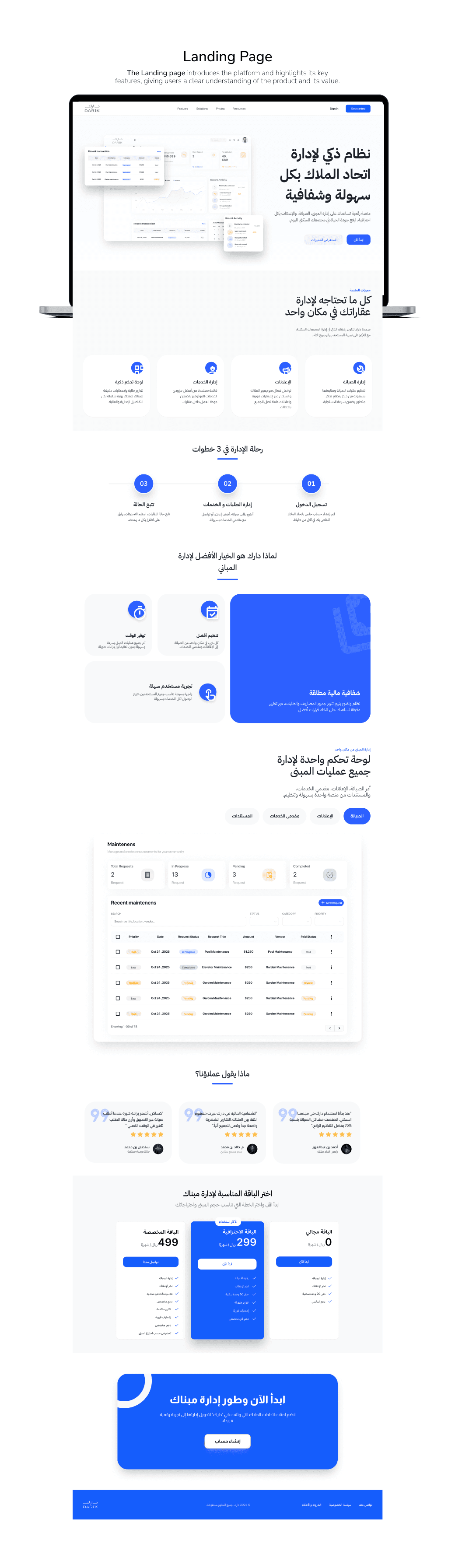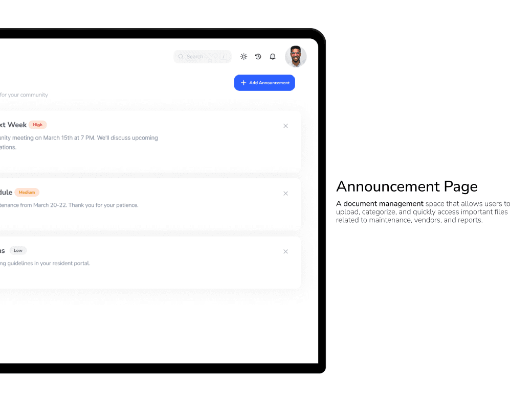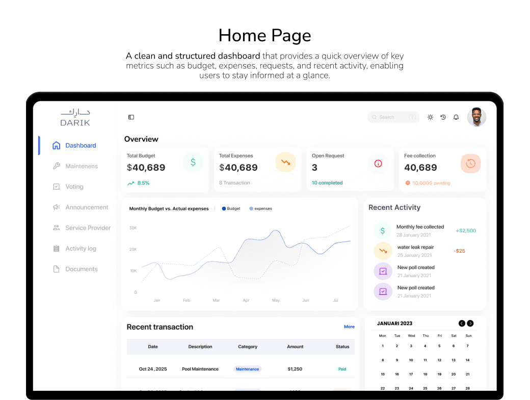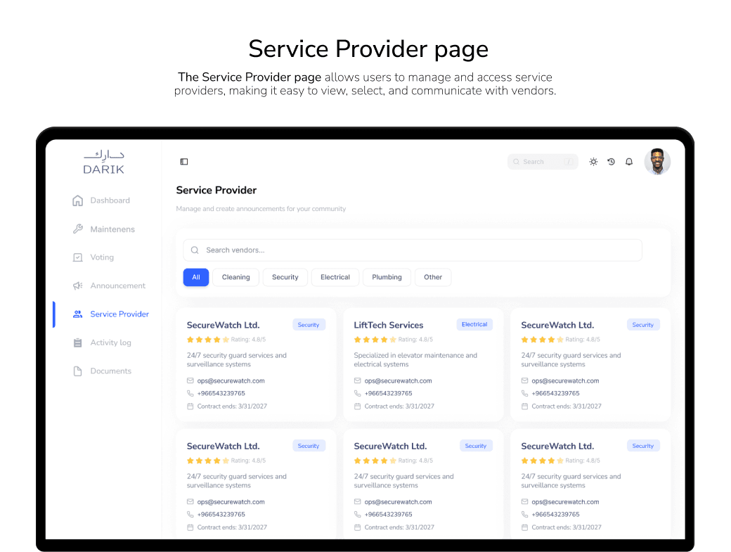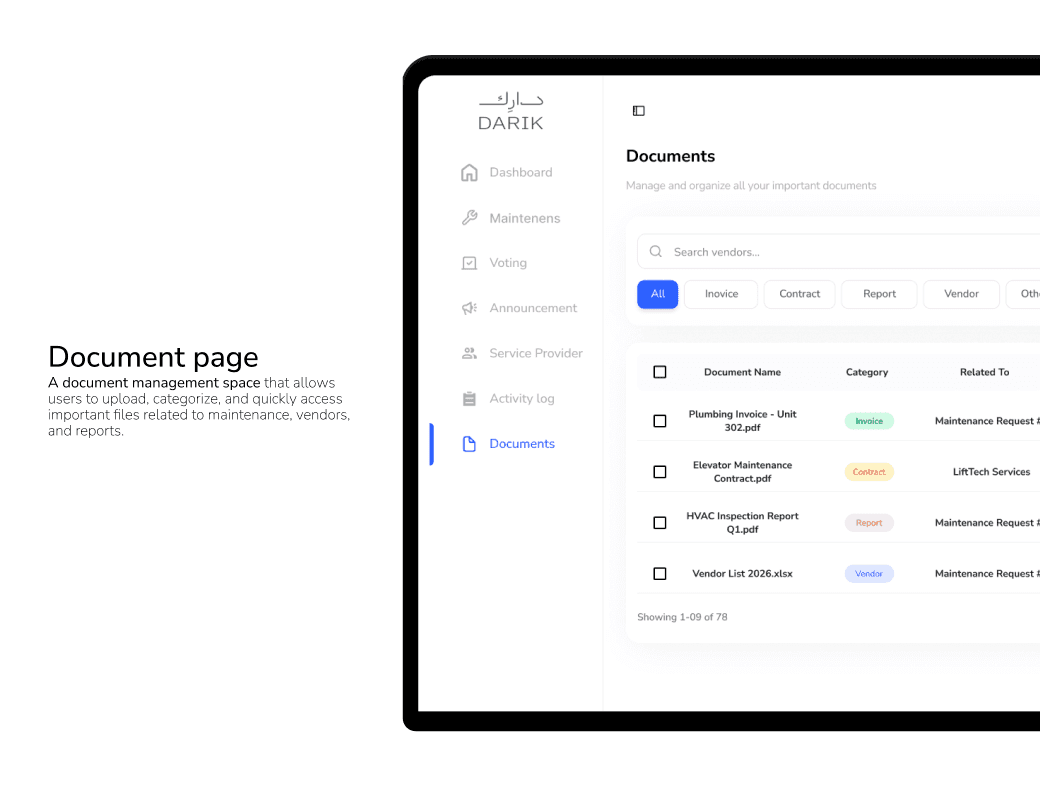 تصميم منصة مركزية تتيح للمستخدمين إدارة جميع خدمات المبنى في مكان واحد، مثل متابعة طلبات الصيانة، الوصول إلى المستندات، ومراقبة الميزانية. يركز الحل على البساطة والوضوح وتعزيز الشفافية لتحسين تجربة المستخدم وكفاءة العمل